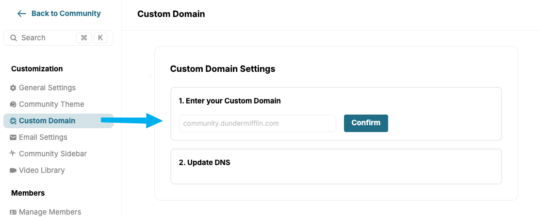 1. Go to Settings > Customization > Custom Domain in your community settings.
