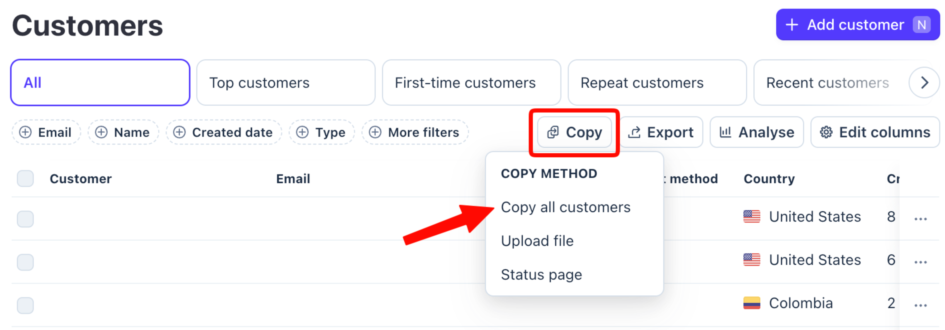 3.3 Click Copy -> Copy all customers: