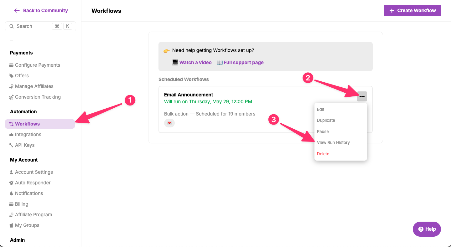 To review the run history of a workflow, go to Settings Workflows and select the 3-dot menu for the workflow you'd like to review. Then select View Run History.