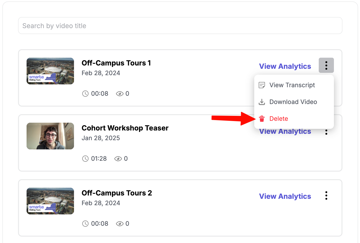 Click on the 3-dot menu of the video you want to delete, then click Delete.
