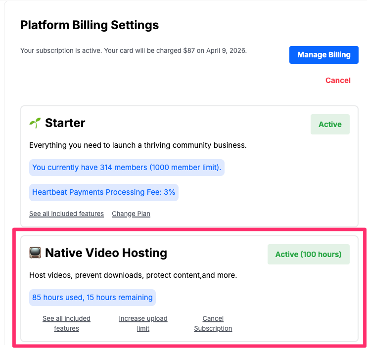 To upgrade, go to Settings > Admin > Platform Billing, then click on Upgrade next to Native Video Hosting. Then choose Monthly or Annual pricing.