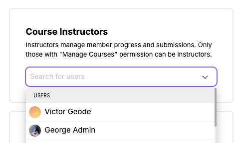 Instructors manage member progress and submissions. Only members with a role that includes the "Manage Courses" permission can be instructors.