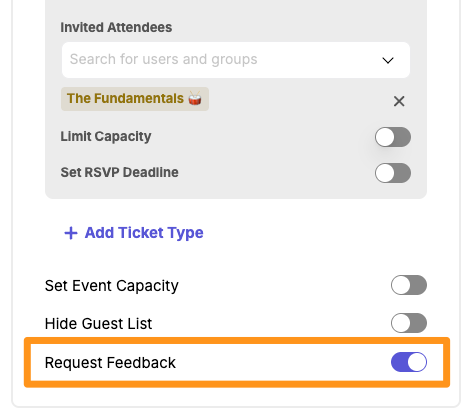 To collect feedback for an Event, you will need to have the "Request Feedback" toggle turned on: