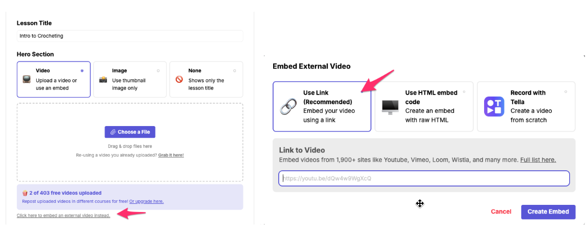 Click on that and you'll see the options for adding the content. We recommend using the link rather than the embed code.