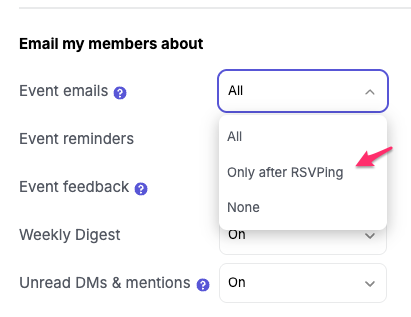 This setting is ideal for organizers hosting many events, and it helps avoid overloading members with emails.