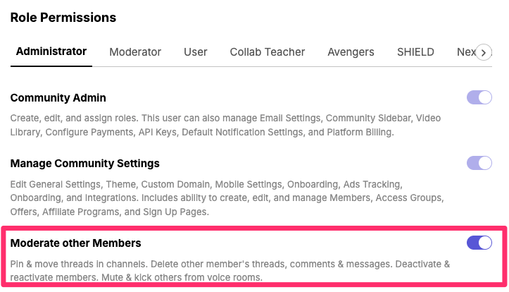 What does the "Moderate other Members" permission do?