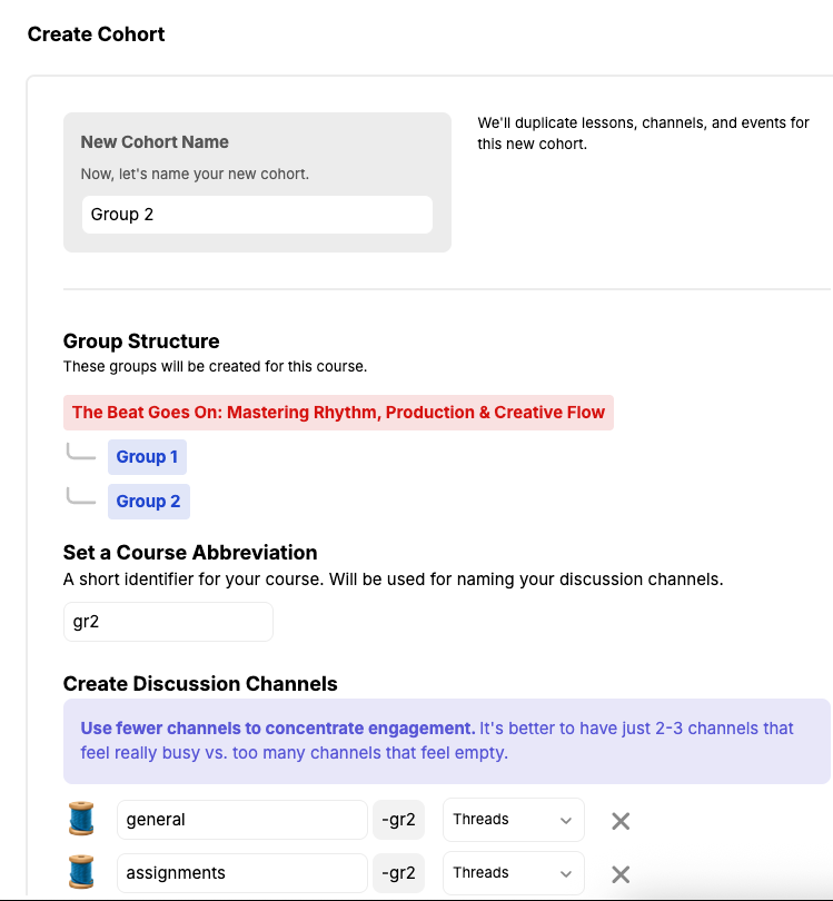 - Create Discussion Channels so members of your cohort have shared spaces within the community to discuss, submit assignments and ask questions