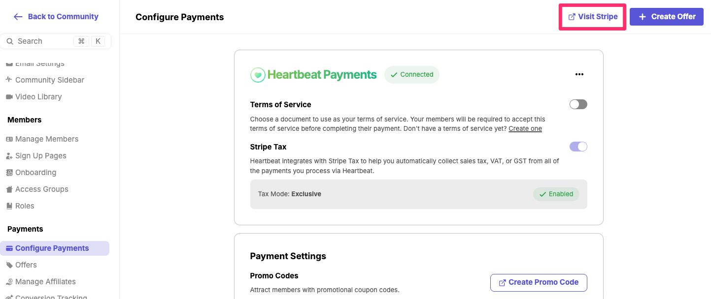 To access Stripe directly from Heartbeat, go to Settings > Payments > Configure Payments and click on "Visit Stripe" on the top left.