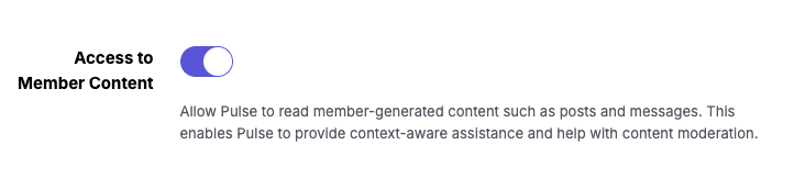 Allow Pulse to read member-generated content such as posts and messages. This enables Pulse to provide context-aware assistance and help with content moderation.