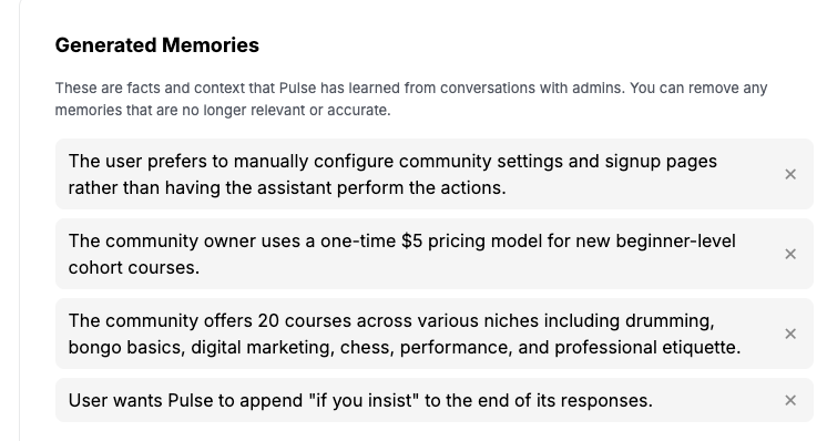 These are facts and context that Pulse has learned from conversations with admins. You can review and remove any memories that are no longer relevant or accurate.