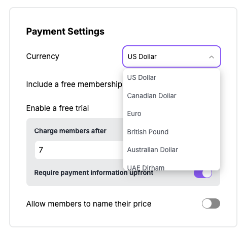 - Under Payment Settings, find the Currency dropdown and select your preferred currency